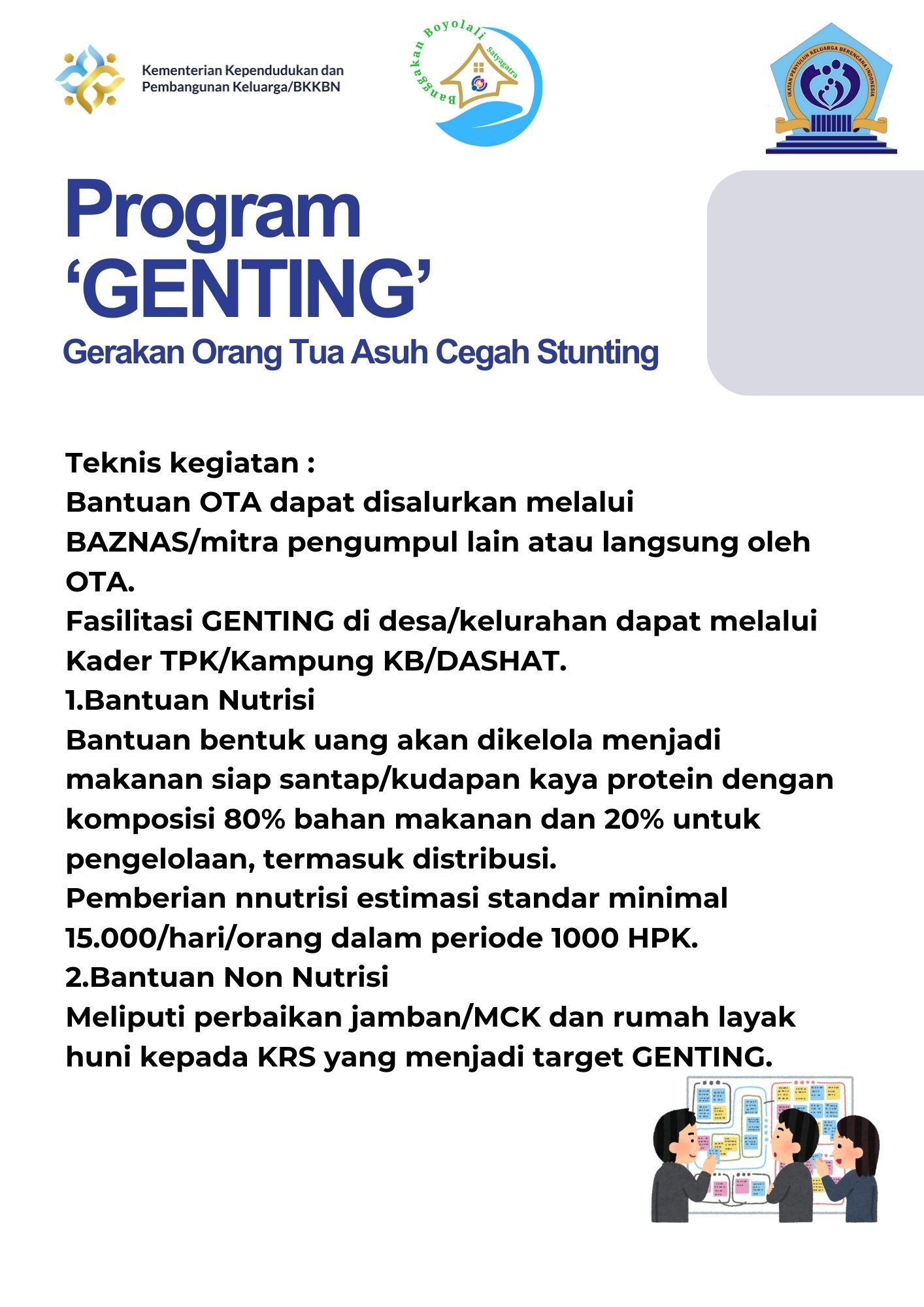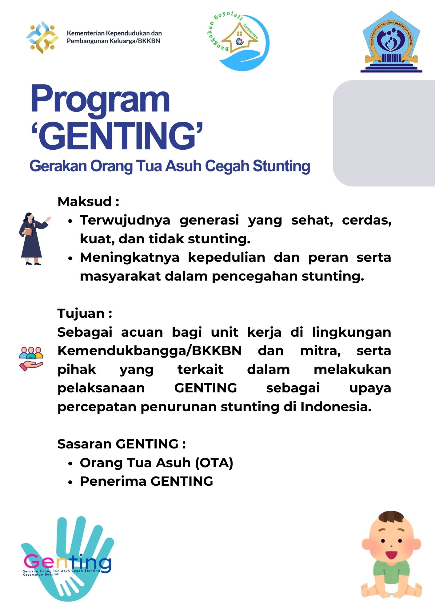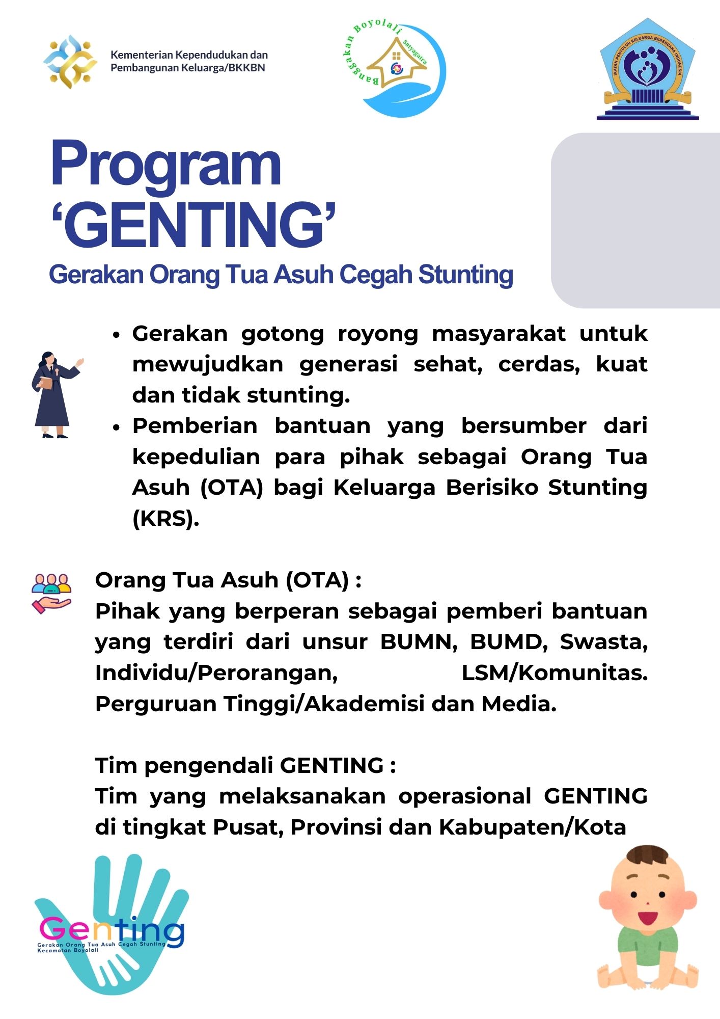 Program GENTING menjadi salah satu program Kemendukbangga/BKKBN untuk mempercepat penurunan stunting dengan konsep gotong royong. Melibatkan masyarakat, swasta, dan pemerintah sebagai orang tua asuh melalui dukungan nutrisi, edukasi, dan perbaikan fasilitas.