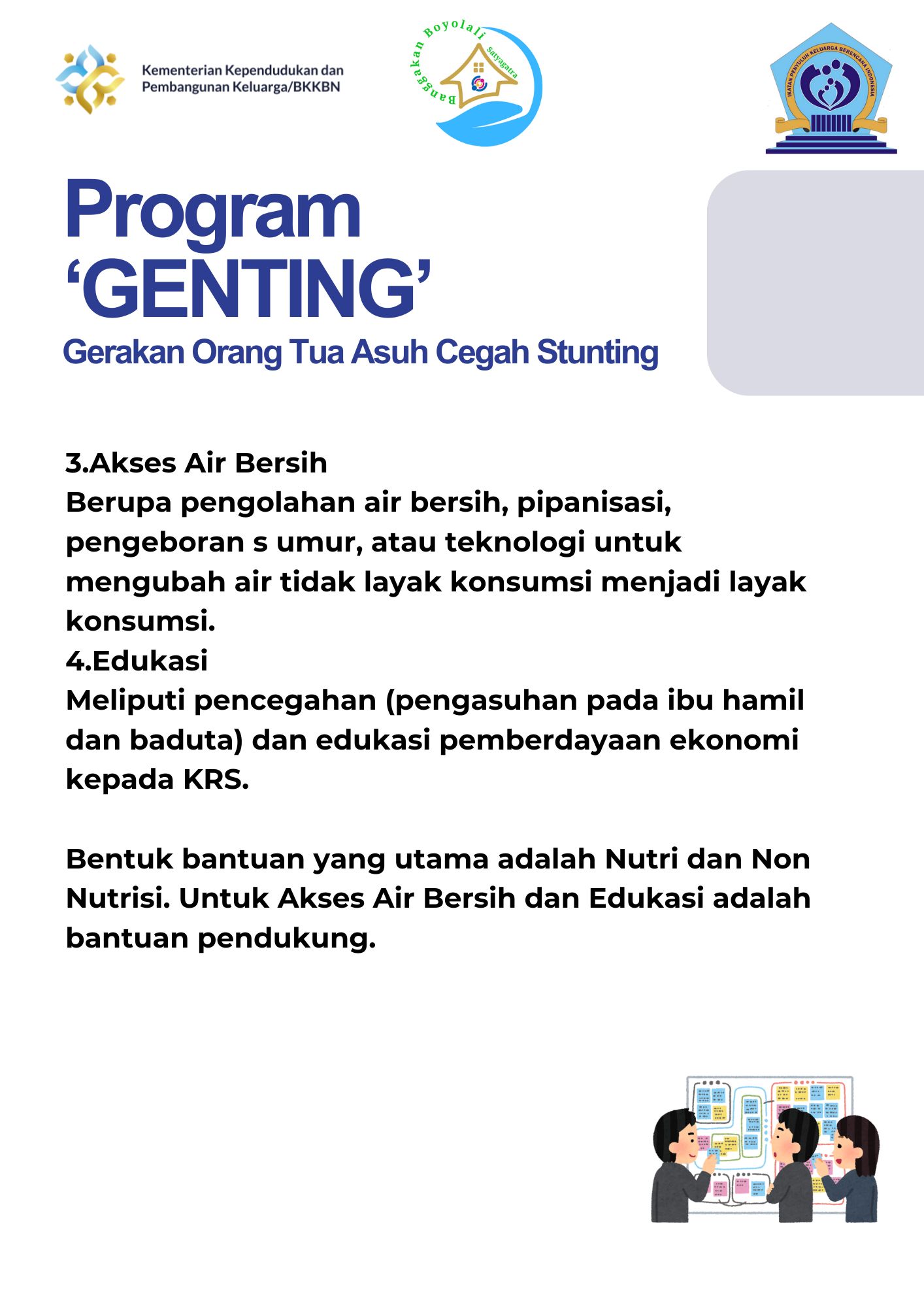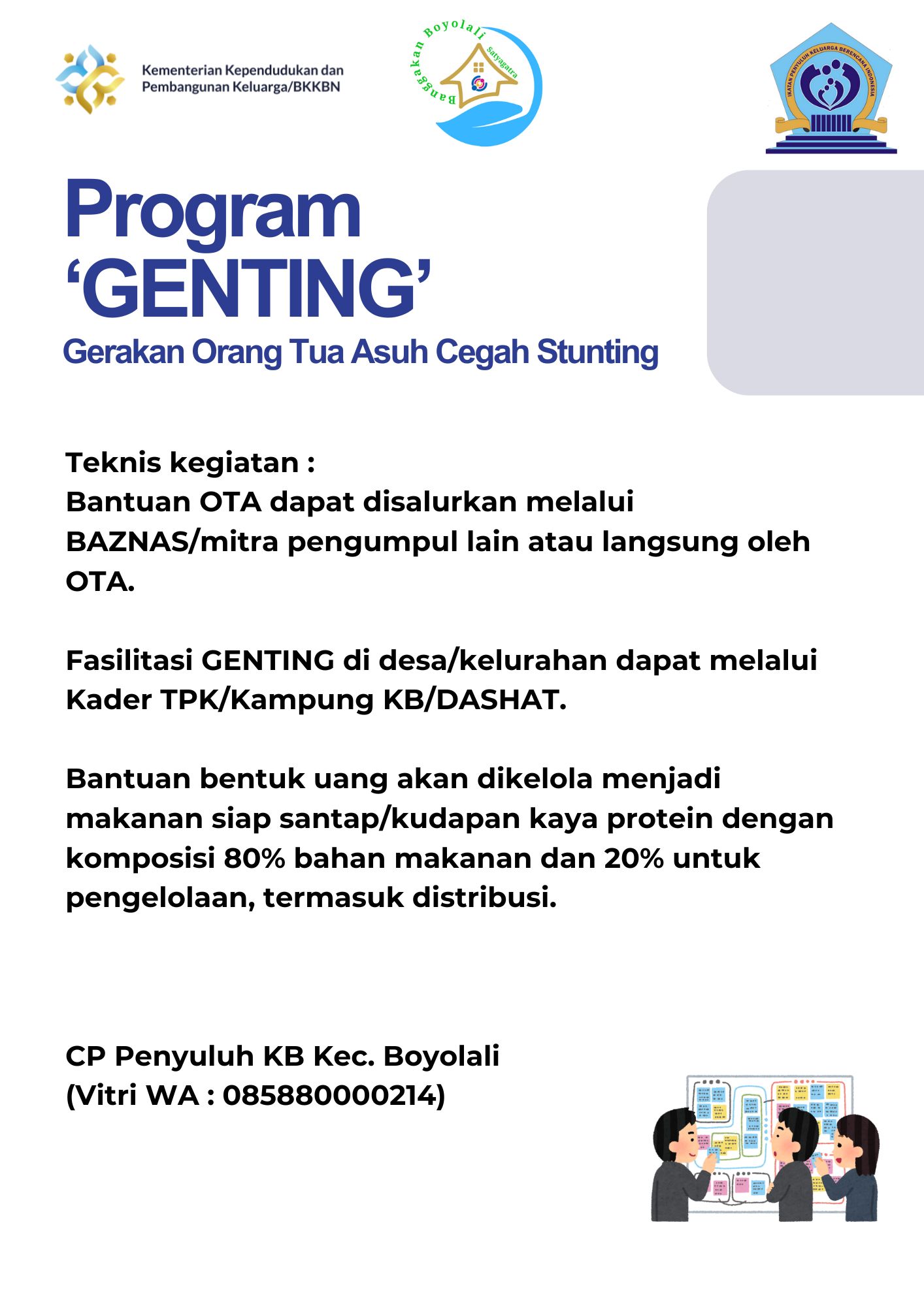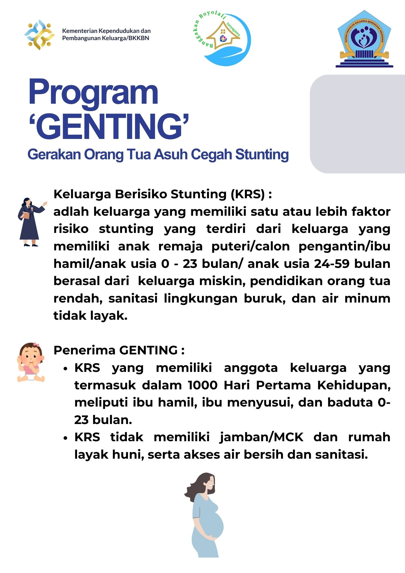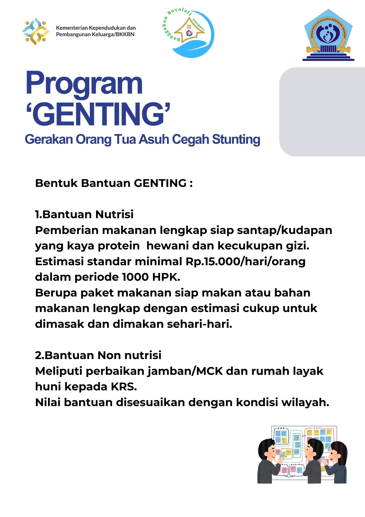 Program GENTING menjadi salah satu program Kemendukbangga/BKKBN untuk mempercepat penurunan stunting dengan konsep gotong royong. Melibatkan masyarakat, swasta, dan pemerintah sebagai orang tua asuh melalui dukungan nutrisi, edukasi, dan perbaikan fasilitas.