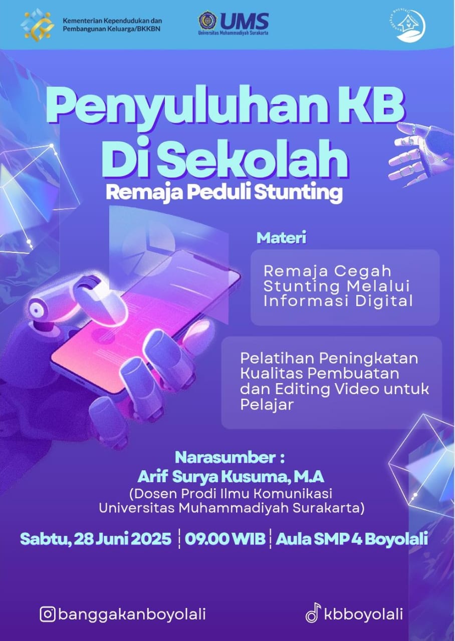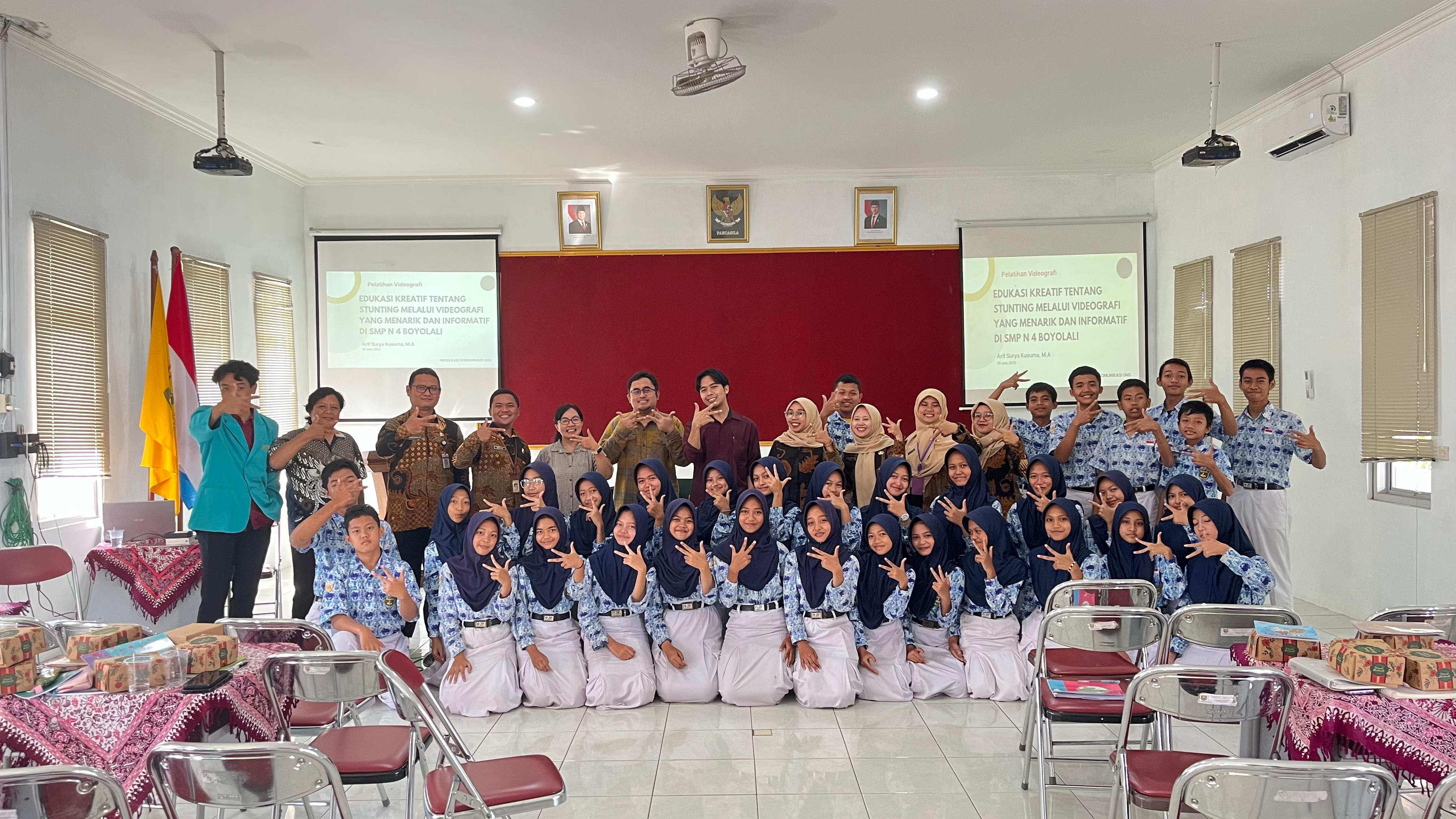 Narasumber adalah dari Dosen Prodi Ilmu Komunikasi dibantu tim dengan judul Peningkatan Kualitas Pembuatan Dan Editing Video Bagi Pelajar dengan tema videonya adalah pencegahan stunting versi remaja.